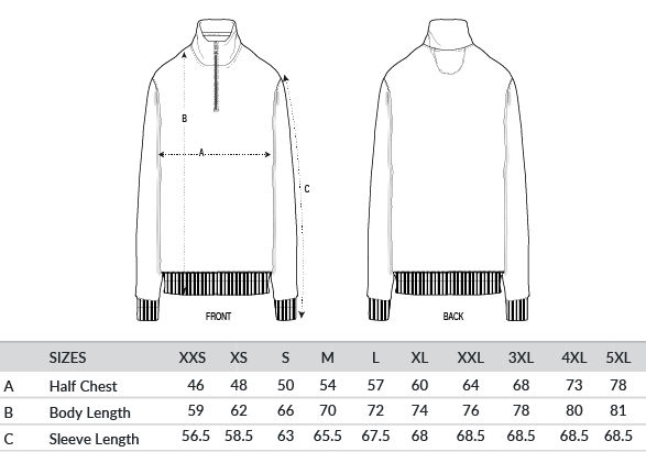 Set-in sleeves. Self-fabric mock neck collar. Quarter-zip at the centre front. 1x1 rib at sleeve cuffs and bottom hem. Double-needle topstitches at the armhole, sleeve cuffs and bottom hem. Herringbone tape at the inside back neck and the inside of the zip. Self-fabric half moon at back neck.
